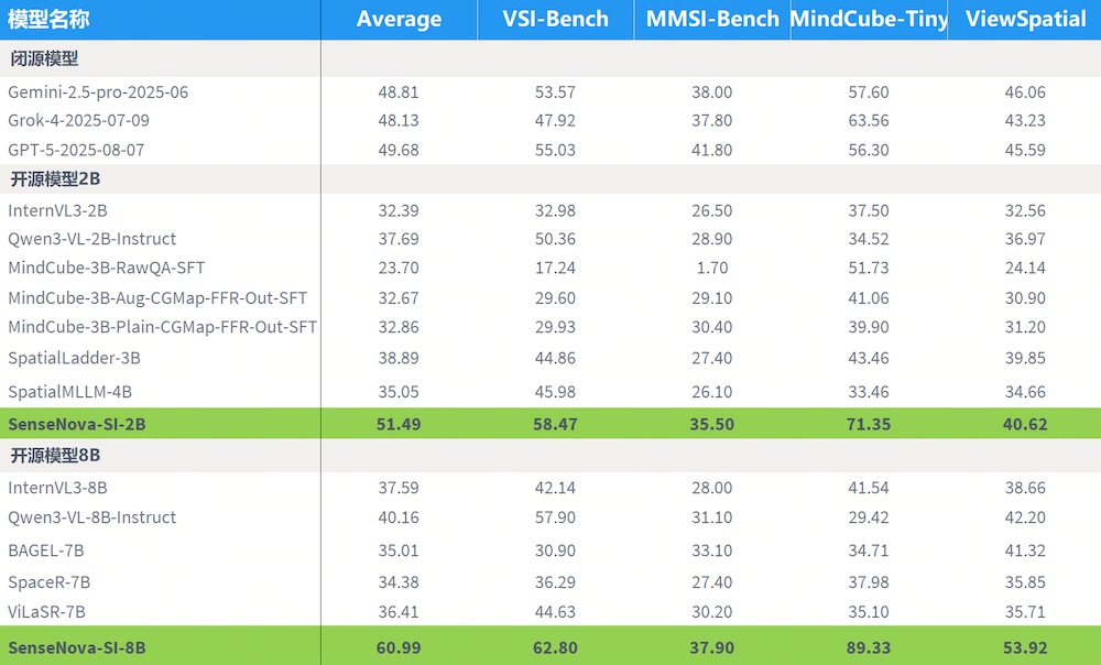 智东西11月11日报道,昨晚,商汤正式发布并开源SenseNova-SI系列空间智能大模型,涵盖2B与8B两个版本。
