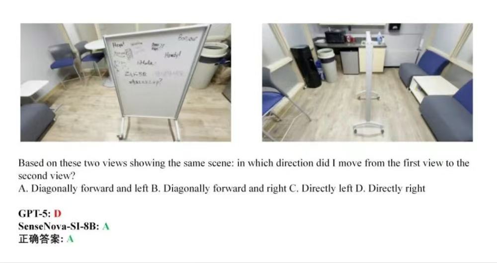 从结果来看,GPT-5在多项题目中出现了误判,而SenseNova-SI-8B则连续给出正确答案,呈现出更稳定的空间理解能力: