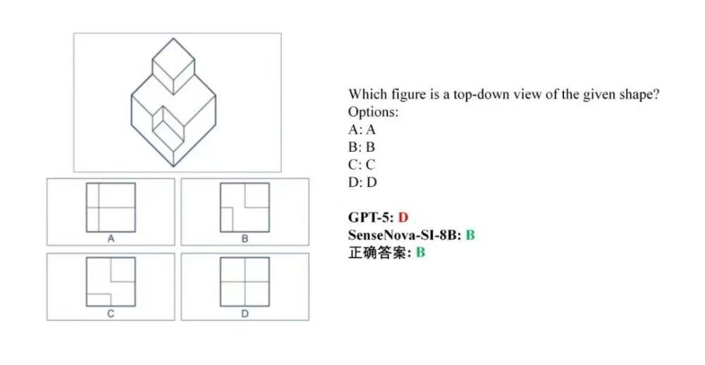 1、俯视图选择题:在立方体组合图形中,要求选择正确俯视图。GPT-5选择了错误的D选项,SenseNova-SI-8B选择了正确的B选项。