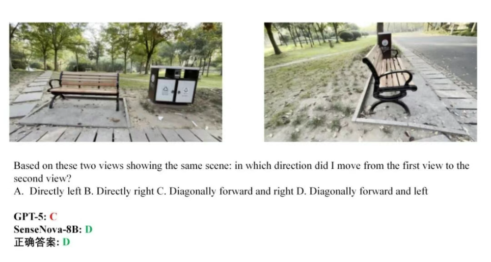 4、视角变换下的方向判断题(户外):通过两张场景图判断观察者的移动方向。GPT-5选择了C,SenseNova-SI-8B选择了正确答案D,即向左前方移动。