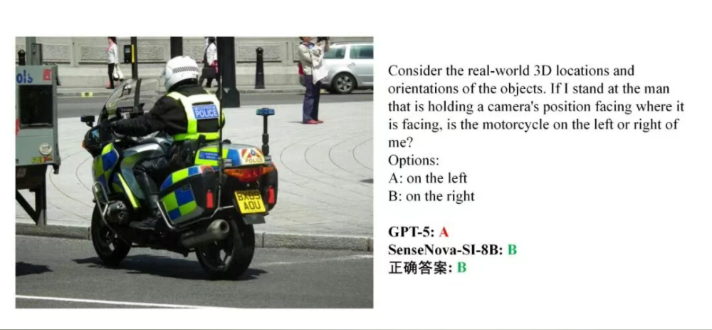 2、相对方位判断题:模拟从相机操作者视角判断摩托车在左侧还是右侧。GPT-5误判为左侧(A),SenseNova-SI-8B正确判断为右侧(B)。