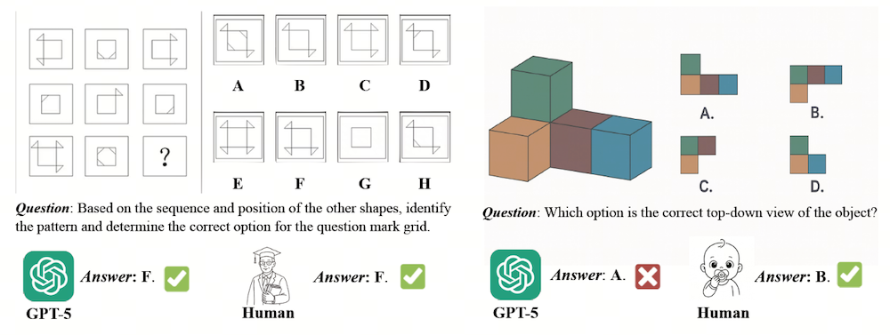 例如,GPT-5可以正确解出复杂图形逻辑题,但面对判断立方体俯视图这类空间题时,却出现了明显错误。这类题对人类儿童来说往往是直觉判断,却仍难住了顶级模型。